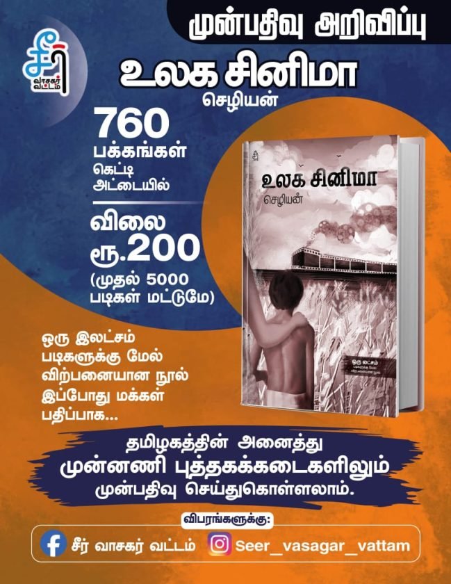 சீர் வாசகர் வட்டத்தின் மக்கள் பதிப்பு நூல்களின் வரிசையில் ஒரு மகுடமாக இயக்குநர் – ஒளிப்பதிவாளர் செழியனின் ‘உலக சினிமா’ வர உள்ளது. விகடனில் தொடராக வெளிவந்து இலட்சக்கணக்கான வாசகர்களின் சினிமா ரசனையை மாற்றிய தொடர் அது. தமிழ் வாசகர்களுக்கு உலக சினிமாவைப் பற்றிய நல்ல திறப்பை ஏற்படுத்திய 93 நல்ல படங்களைப் பற்றிய கட்டுரைகளையும் 93 நல்ல சிறுகதைகள் என்றுகூட சொல்லலாம்.