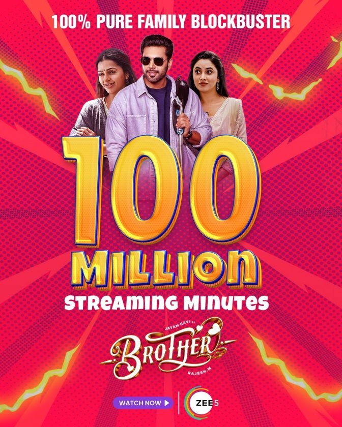 ZEE5 இல் கடந்த நவம்பர் 29 ஆம் தேதி பிரதர் திரைப்படம் வெளியானது. இப்படம் ரசிகர்கள் மற்றும் குடும்ப பார்வையாளர்களிடம், பெரும் வரவேற்பைப் பெற்றுள்ளது. ZEE5 இல் வெளியான வேகத்தில் 100 மில்லியன் பார்வை நிமிடங்களைக் கடந்து சாதனை படைத்துள்ளது.
