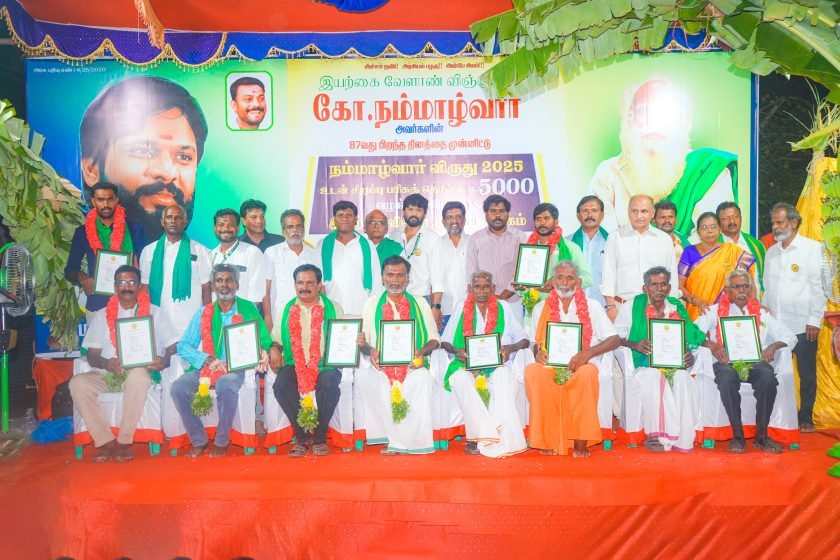 மதுரை மாவட்டம் உசிலம்பட்டி முருகன் கோவில் முன்பு நடிகரும், தவெக தலைவர் விஜய் -யின் ஆதரவாளரான சௌந்தரராஜாவின் மண்ணுக்கும் மக்களுக்கும் அறக்கட்டளை சார்பில் நம்மாழ்வாரின் 87வது பிறந்த நாளை முன்னிட்டு இயற்கை விவசாயிகள் 11 பேருக்கு நம்மாழ்வார் விருதும், 5 ஆயிரம் ரூபாய் ரொக்கமும் வழங்கி ஊக்கபடுத்தினார்.,