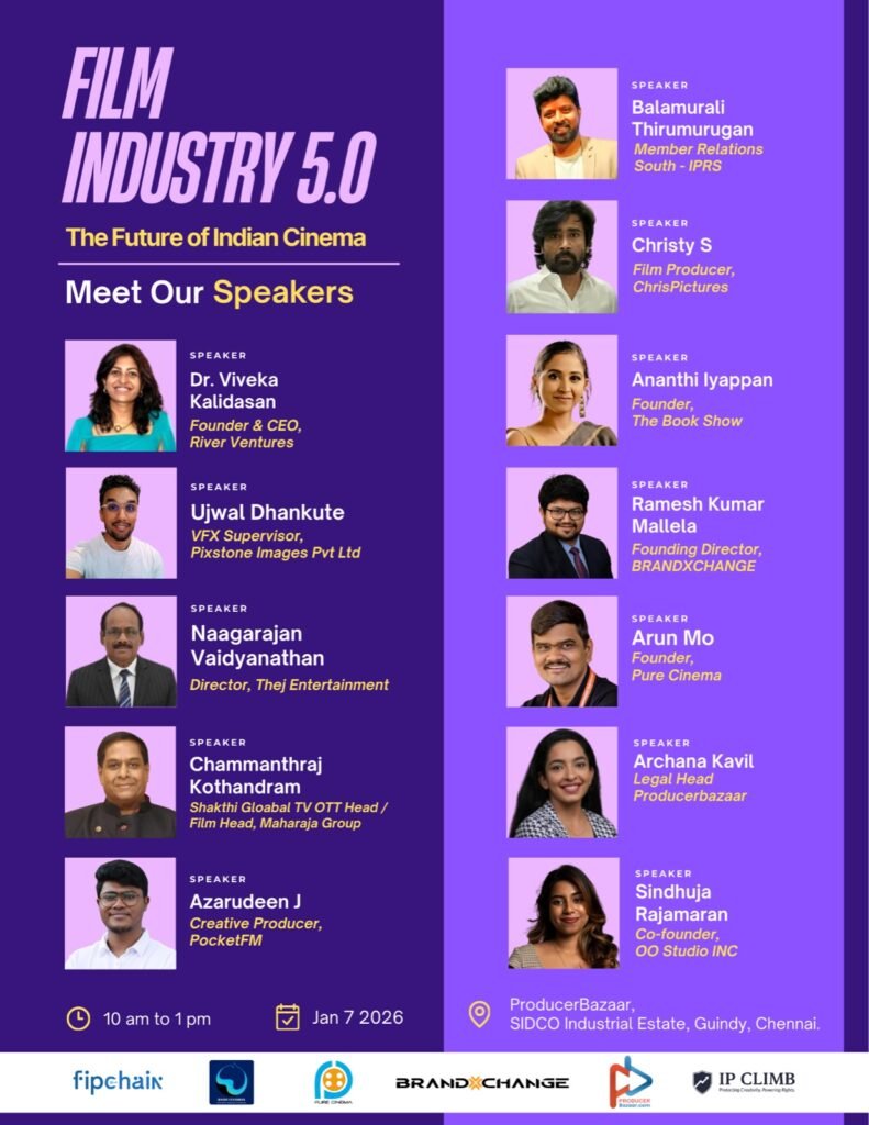 ஃபிப்செயின், ரிவர் வென்ச்சர்ஸ், பியூர் சினிமா, பிராண்ட் சேஞ்ச், ஐபி கிளைம்ப், புரொடியூசர் பஜார் ஆகிய நிறுவனங்கள் இணைந்து “ஃபிலிம் இன்டஸ்ட்ரி 5.0: தி ஃபியூச்சர் ஆஃப் இந்தியன் சினிமா” எனும் கருத்தரங்கை சென்னையில் புதன்கிழமை (ஜனவரி 7) அன்று நடத்தின. கிண்டி சிட்கோ தொழிற்பேட்டையில் உள்ள புரொடியூசர் பஜார் அலுவலகத்தில் இது நடைபெற்றது.