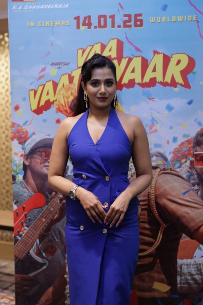 ஒரு பேட்டியில் நலன் சார் ஒரே விஷயத்தை *“இது ஒரு பெஸ்டிவல் படம். பல குடும்பங்கள் ஒன்றாகச் சேர்ந்து வந்து பார்க்கிற படம்”*என்று சொன்னார். இப்போது அது அப்படியே நடந்துள்ளது. குடும்பமா, நண்பர்களோடு, எல்லாரும் சேர்ந்து படம் பார்க்கிற மாதிரி இந்த படம் மாறியிருக்கிறது. அதுக்கு நான் ரொம்ப ரொம்ப சந்தோஷப்படுறேன். இந்த படம் தாமதமானது பற்றி நிறைய பேர் என்கிட்ட கேட்டார்கள். அந்த நேரத்தில் எனக்கும் கொஞ்சம் வருத்தமா தான் இருந்தது. ஆனால் நான் ஒன்று நம்புகிறேன் – நல்ல விஷயம் நடக்கவேண்டுமானால், அதுக்கு ஒரு சரியான நேரம் இருக்கும். கடவுள் நம்மளை காத்திருக்க வைக்குறார்னா,அதுக்குப் பின்னால் ஒரு பெரிய திட்டம் இருக்கும்னு நம்புறேன். அதனால இப்போ எல்லாம் சரியா நடந்ததுக்கு நான் ரொம்ப மகிழ்ச்சியா இருக்கிறேன். இந்தப்படத்தில் என்னைச் சேர்த்ததுக்காக நலன் சார், மற்றும் ஞானவேல் சார் இருவருக்கும் என் மனமார்ந்த நன்றி. நலன் சார் இந்த படத்திற்காக எவ்வளவு கடினமா உழைத்திருக்கார்னு நான் நேரில பார்த்திருக்கேன். அவர் வெற்றியைப் பார்க்க ஆவலாக இருக்கிறேன். கார்த்தி சாரின் தீவிர ரசிகை நான், ஆனால் அவரை நேரில சந்திச்ச பிறகு, நான் இன்னும் பெரிய ரசிகையா மாறிவிட்டேன். ‘வா வாத்தியார்’ கதாபாத்திரம் – பெரியதாக இருந்தாலும், அதை அவரைவிட சிறப்பாக யாராலும் செய்ய முடியாது. கார்த்தி மனதளவில் மிகச்சிறந்த மனிதர். அது அவரது கதாப்பாத்திரங்களிலும் பிரதிபலிக்கிறது, வா வாத்தியார் ஒரு நல்ல மனசு கொண்ட கேரக்டர் அது அவருக்குள்ள இயல்பாகவே இருக்கிறது. நான் அவரிடமிருந்து நிறைய கற்றுக்கொண்டேன். சந்தோஷ் நாராயணன் இசை படத்திற்கு மிகப்பெரிய பலமாக அமைந்துள்ளது. இப்படத்தில் உழைத்த அத்தனை கலைஞர்களுக்கும் நன்றி. அனைவருக்கும் நன்றி
